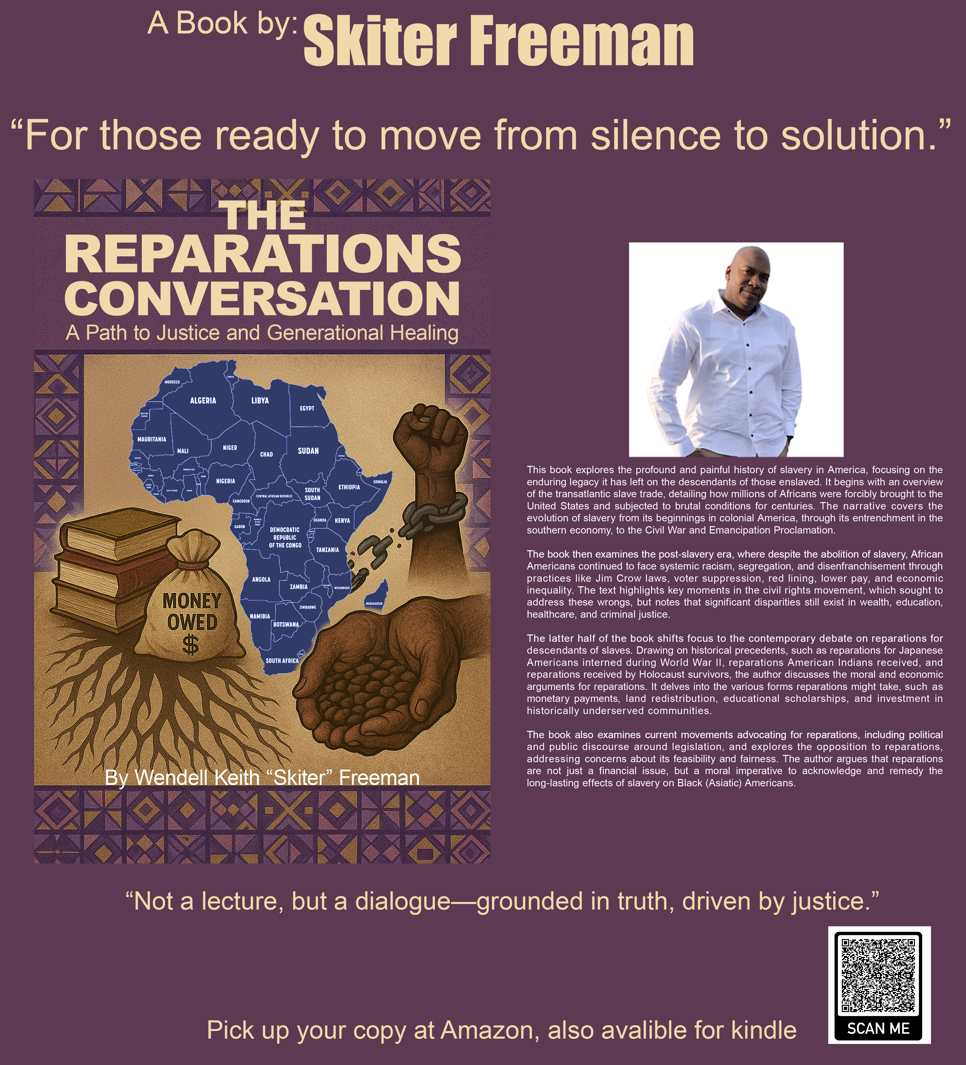 CONGRATULATIONS to Keith Freeman on his book “The Reparation Conversation.. The book examines current movements advocating for reparations, including political and public discourse around legislation, and explores the opposition to reparations, addressing concerns about its feasibility and fairness. He argues that reparations are not just a financial issue, but a moral imperative to acknowledge and remedy the long-lasting effects of slavery on Black (Asiatic) Americans. You can find the book on Amazon.com or you can scan the QR code.